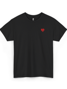 Czarna koszulka z czerwonym nadrukiem w kształcie serca, którego częścią jest rękawica bokserska. Symbol pasji, miłości i życia w rytmie boksu.