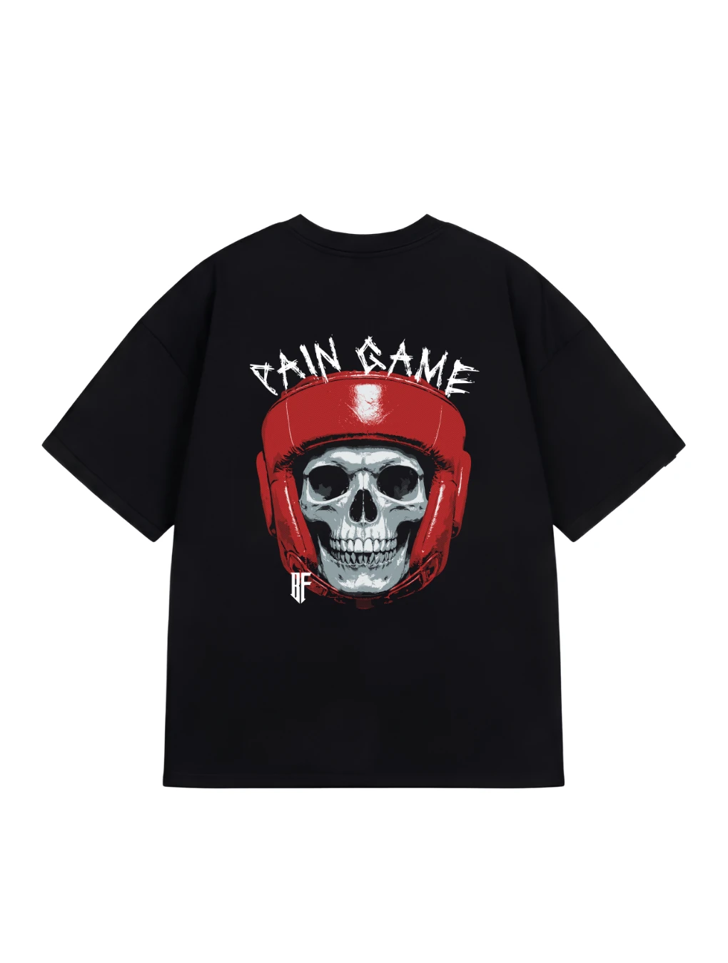 Na przodzie znajduje się subtelny nadruk z napisem "PAIN GAME", umieszczony na lewej piersi. Z tyłu dominuje duża, przyciągająca wzrok grafika przedstawiająca czaszkę w czerwonym kasku bokserskim. To symbol odporności, determinacji i gotowości na każde wyzwanie, jakie stawia trening i życie.